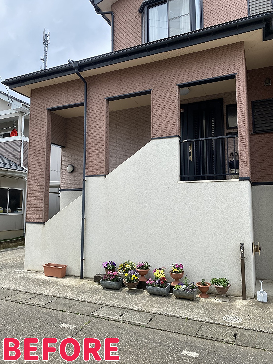落ち着いたブラウンの外部手摺は、木目の玄関周りになじんでおしゃれに仕上がりました😊💗