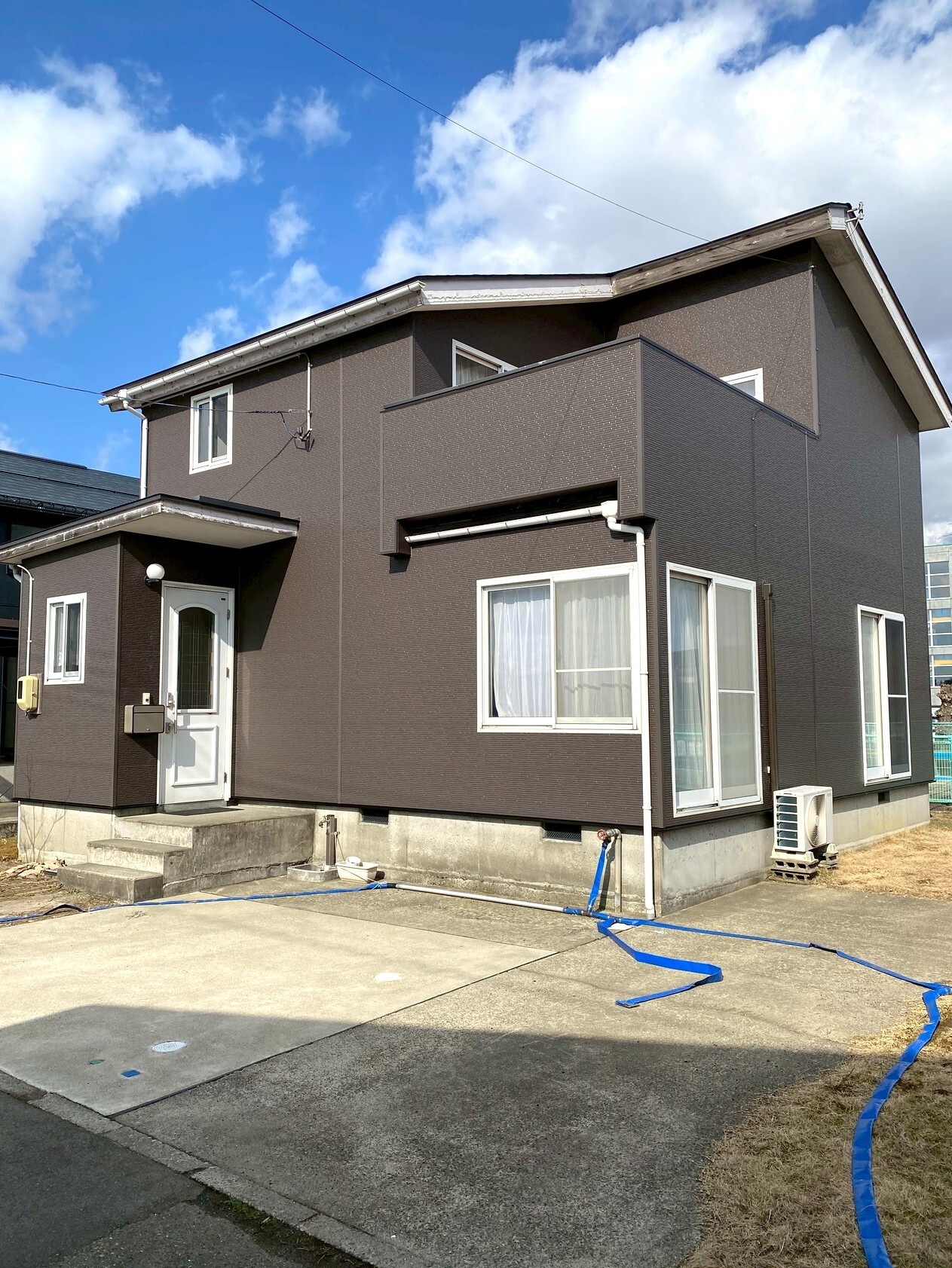 外壁の茶色と、玄関やサッシの白のコントラストで、印象がガラッと変わりましたね😄